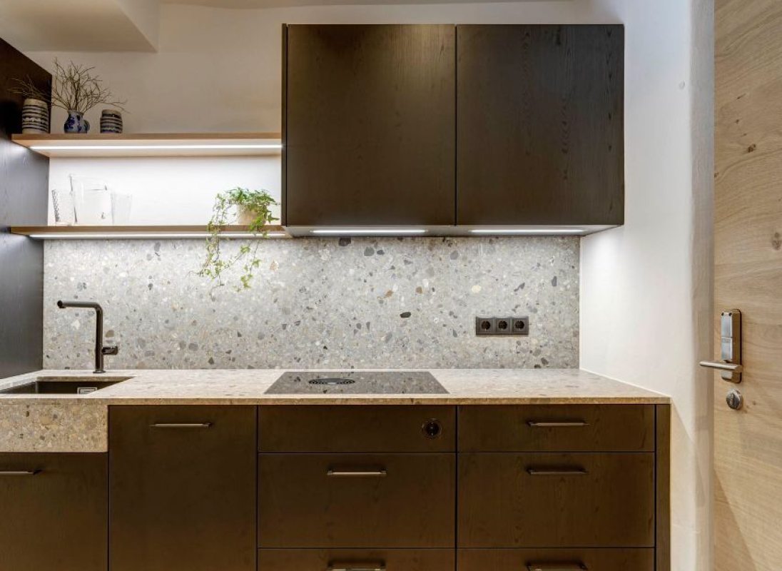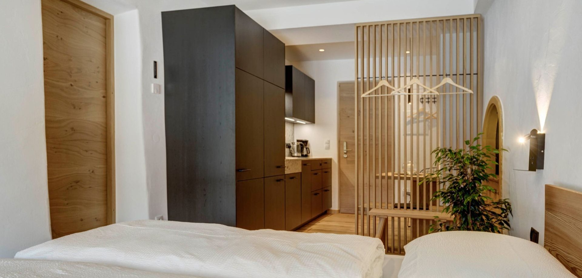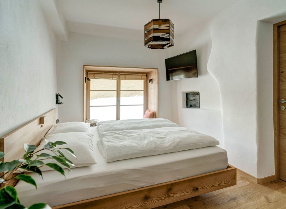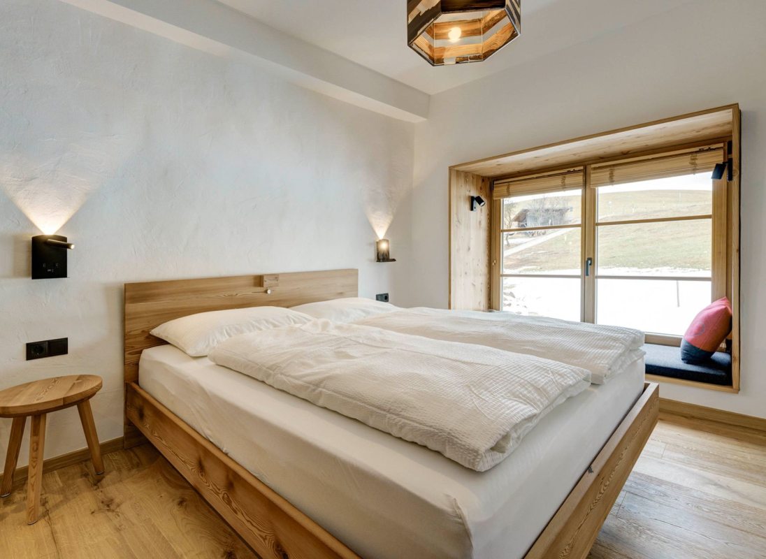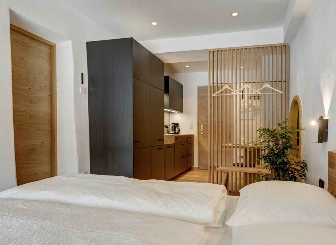 The 32 sqm apartment "Labe" with bedroom, kitchen-living room and bathroom enchants with its fresh and modern ambience and warm coziness. The quiet location with a view of the greenery provides the necessary relaxation. Hiking on the Alpe di Siusi during the day and simply relaxing in the evening.