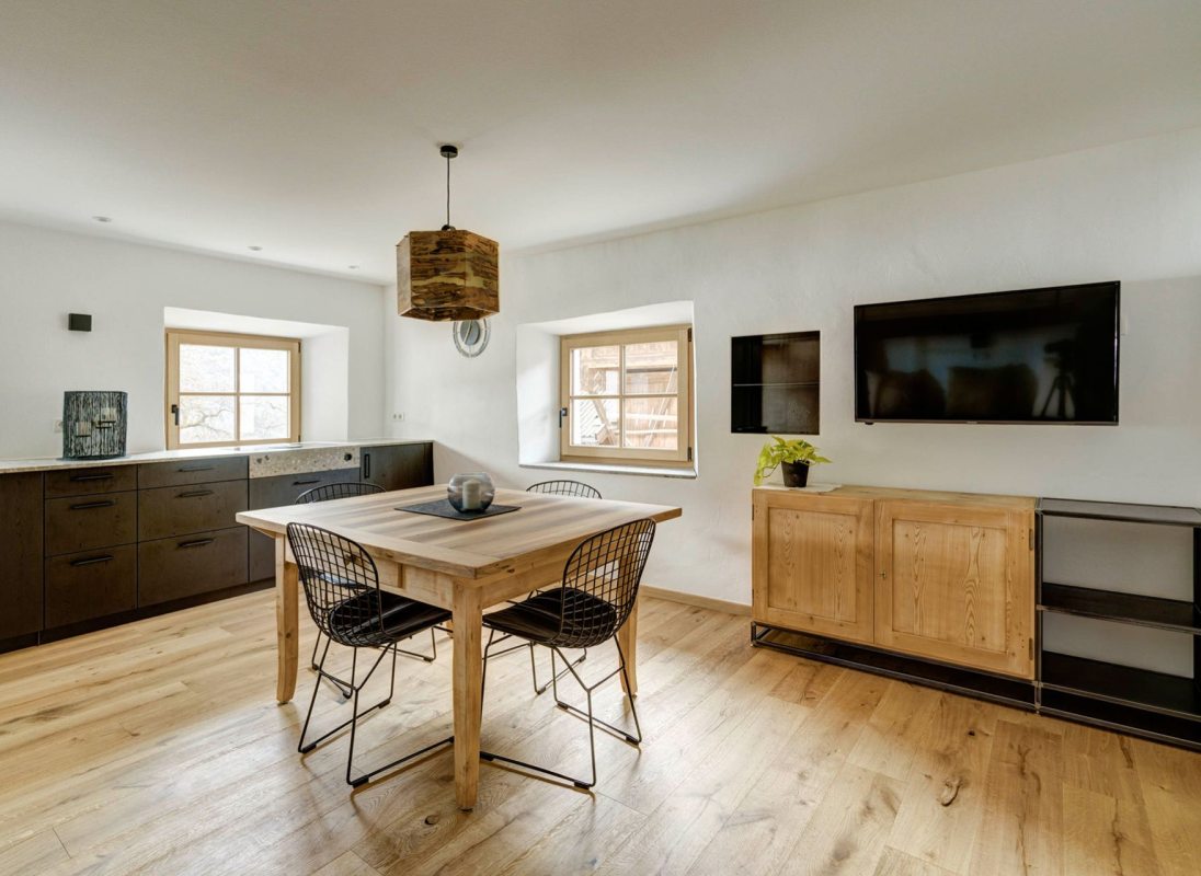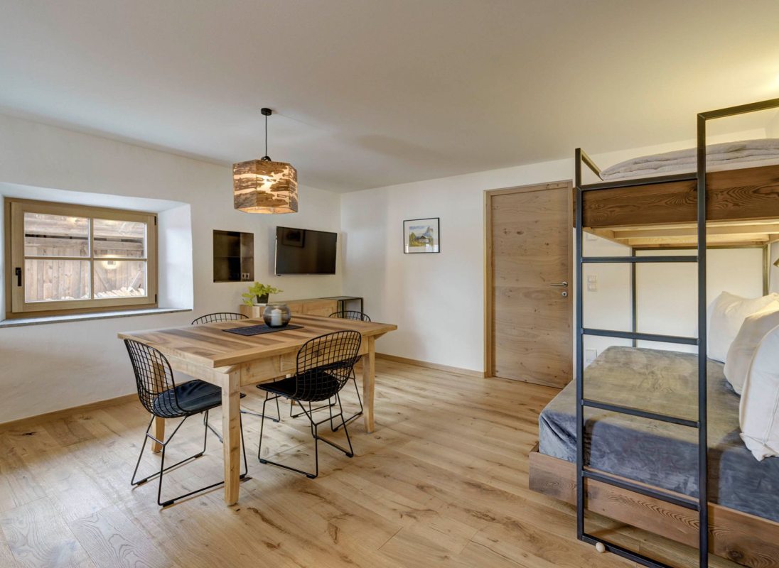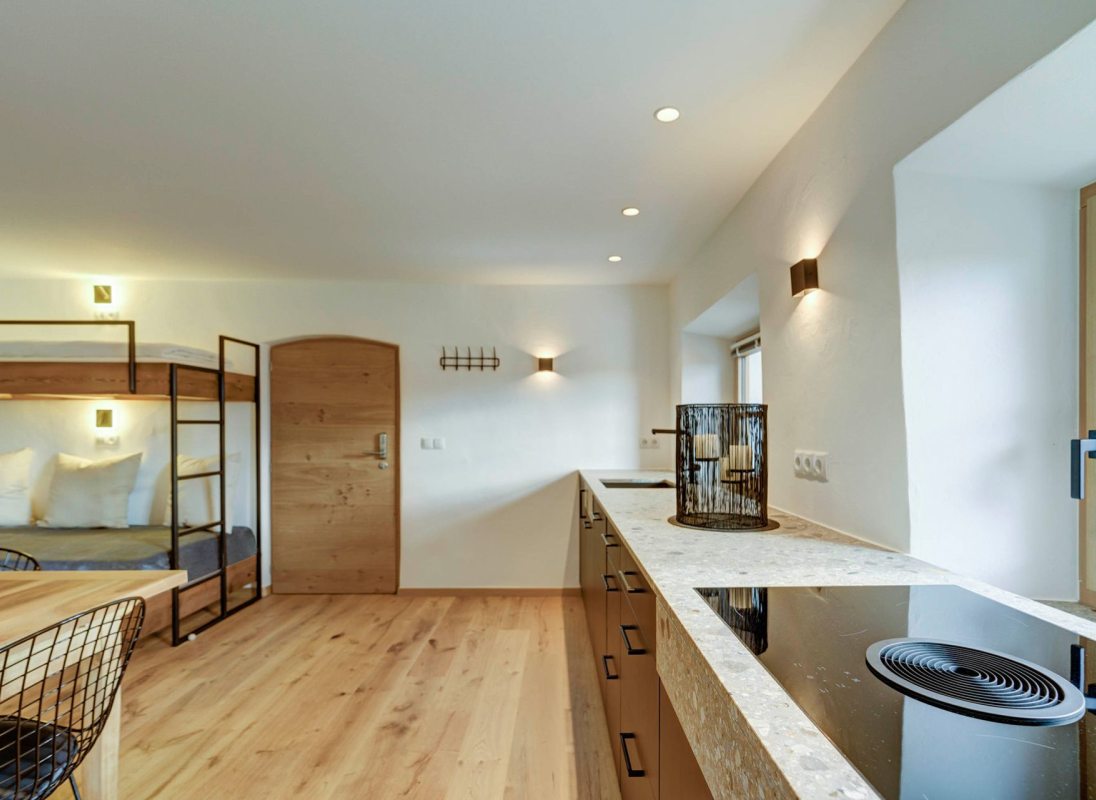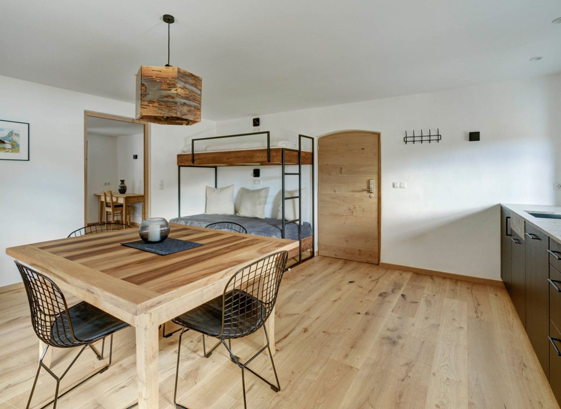 Our apartment "Stube" with 46 sqm is suitable for a cozy time for two or even for a small group. Equipped with a comfortable double bed and a bunk bed sofa, a fully equiped kitchen and a view of