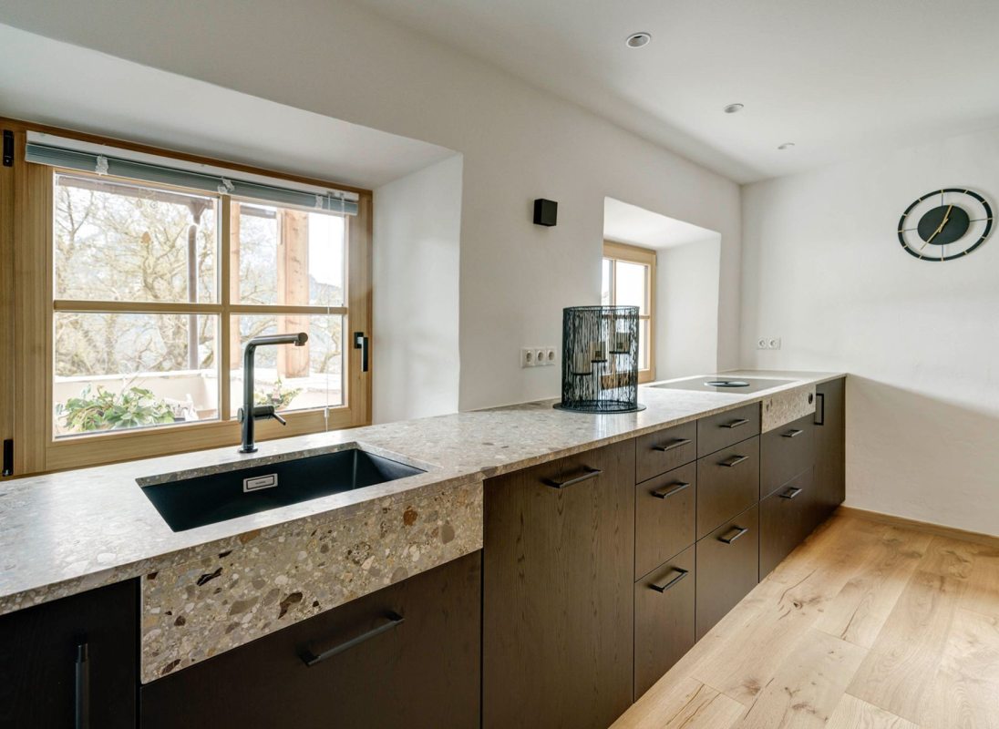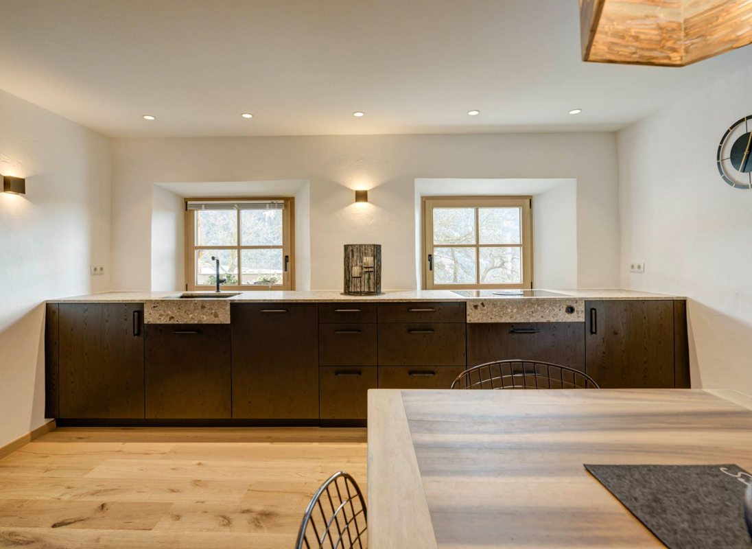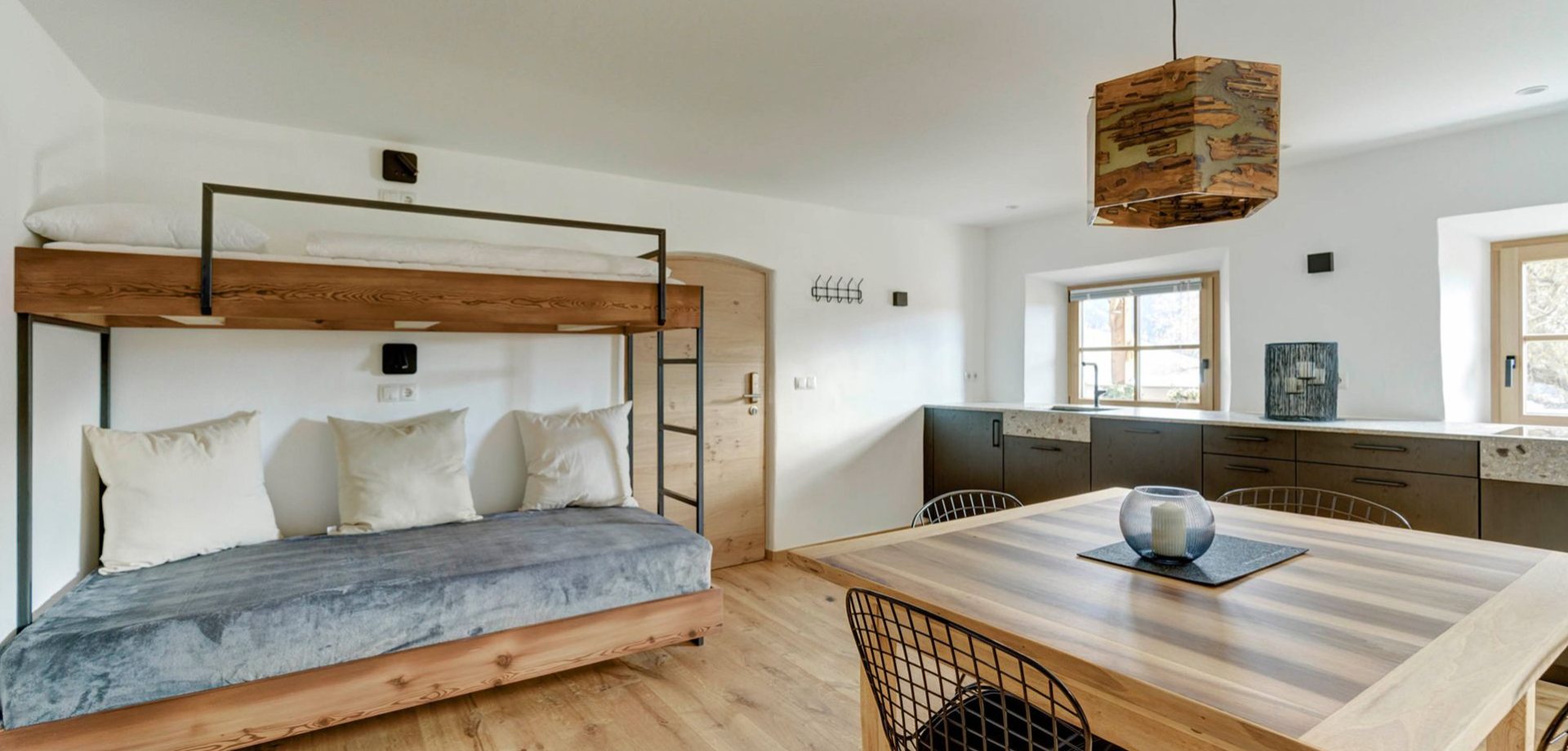 Our apartment "Stube" with 46 sqm is suitable for a cozy time for two or even for a small group. Equipped with a comfortable double bed and a bunk bed sofa, a fully equiped kitchen and a view of